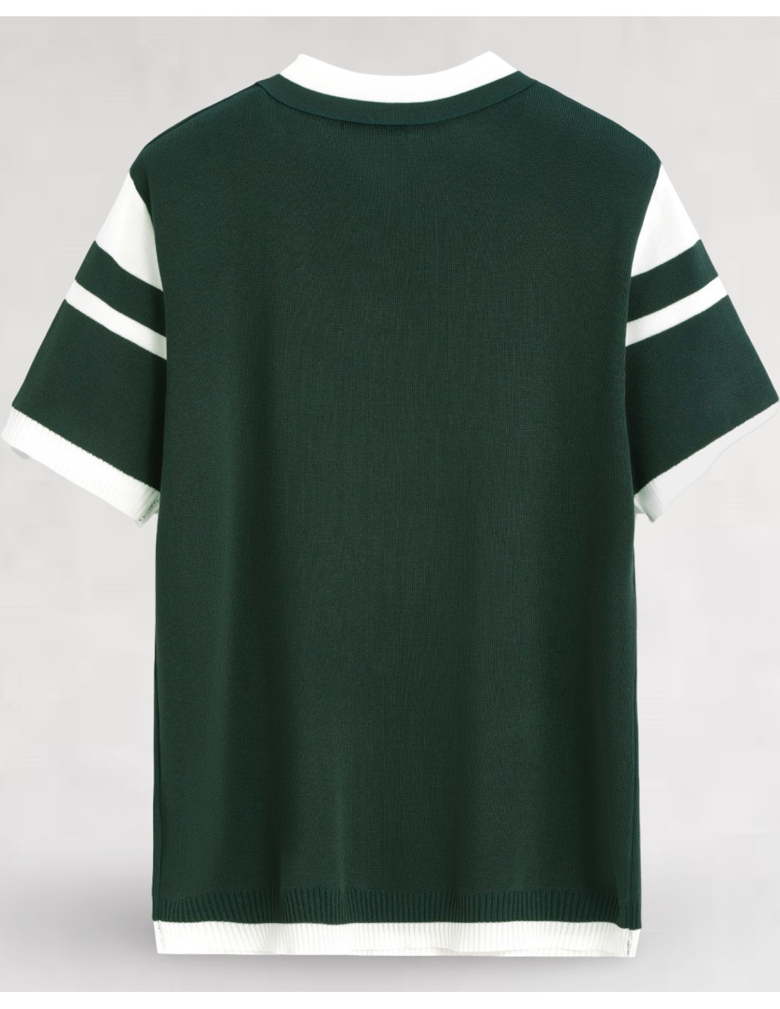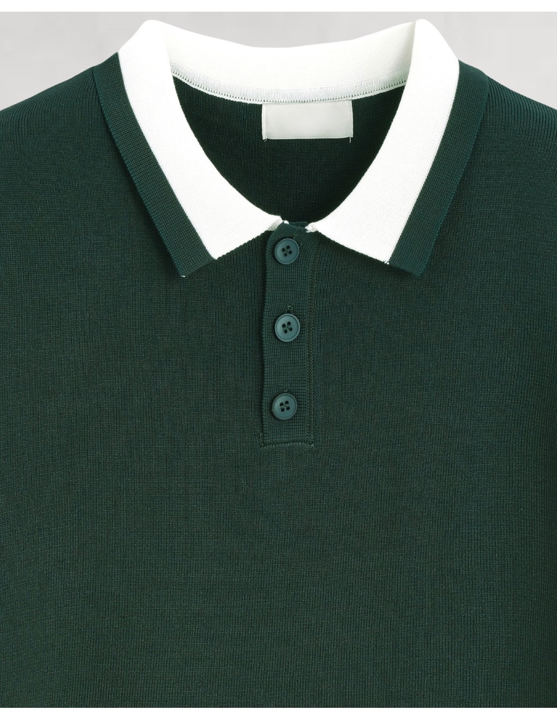 Polo en maille fine, décliné dans un vert profond contrasté par des détails ivoire nets et graphiques. Le col polo structuré et la patte de boutonnage à trois boutons apportent une lecture classique, réinterprétée par un jeu de contrastes franc et maîtrisé.