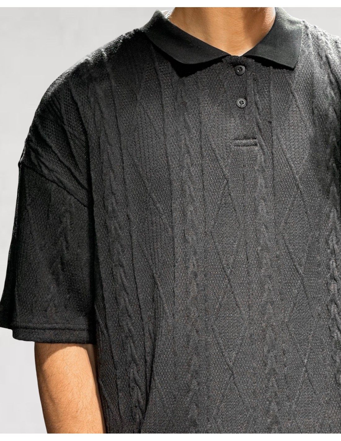 Polo noir en maille, au style minimaliste et structuré. La coupe ample apporte un tombé fluide et une silhouette moderne, parfaite pour un look actuel et confortable. La texture en maille texturée verticale donne du relief à la pièce tout en restant sobre.