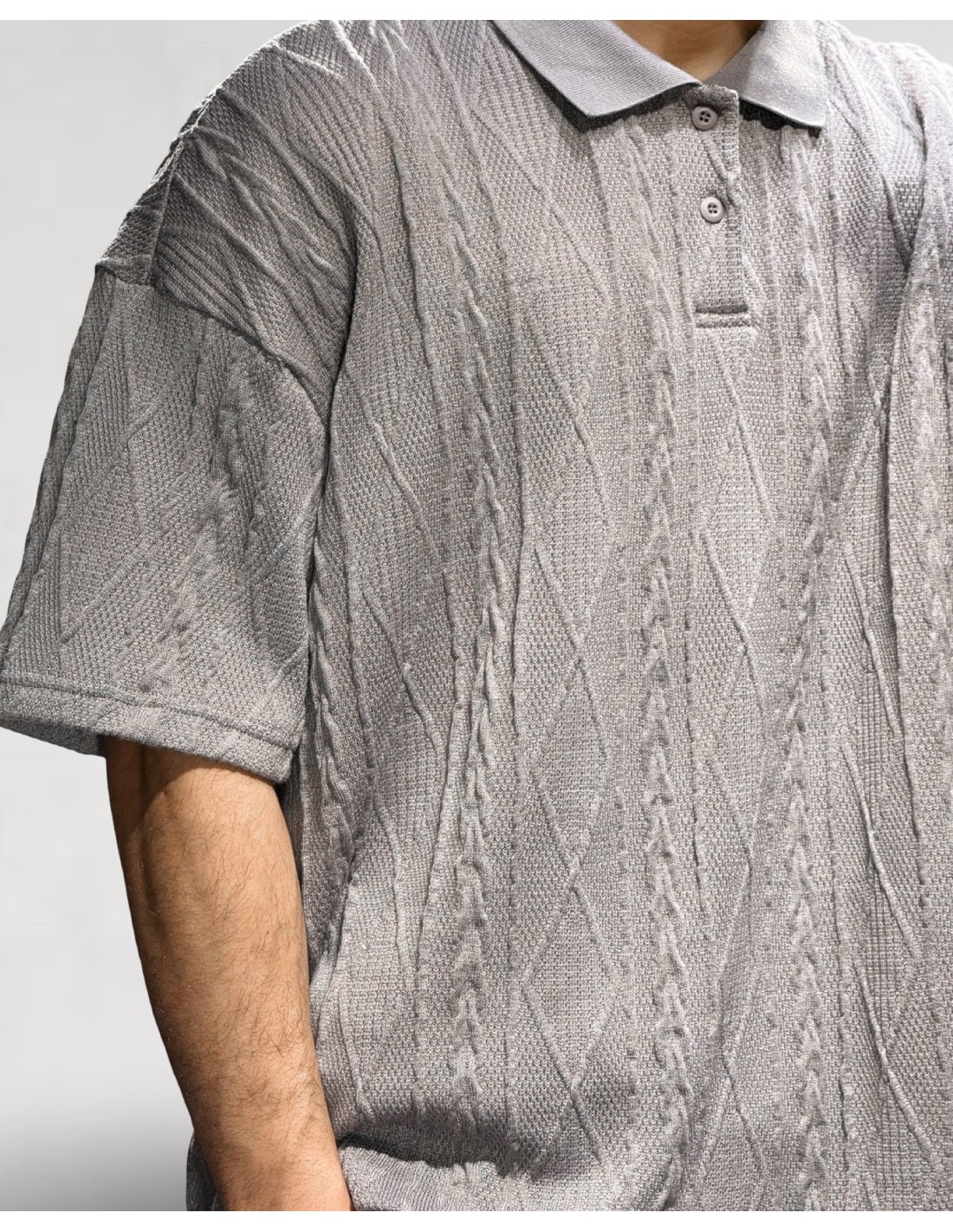 Polo gris en maille, au style minimaliste et structuré. La coupe ample apporte un tombé fluide et une silhouette moderne, parfaite pour un look actuel et confortable. La texture en maille texturée verticale donne du relief à la pièce tout en restant sobre.
