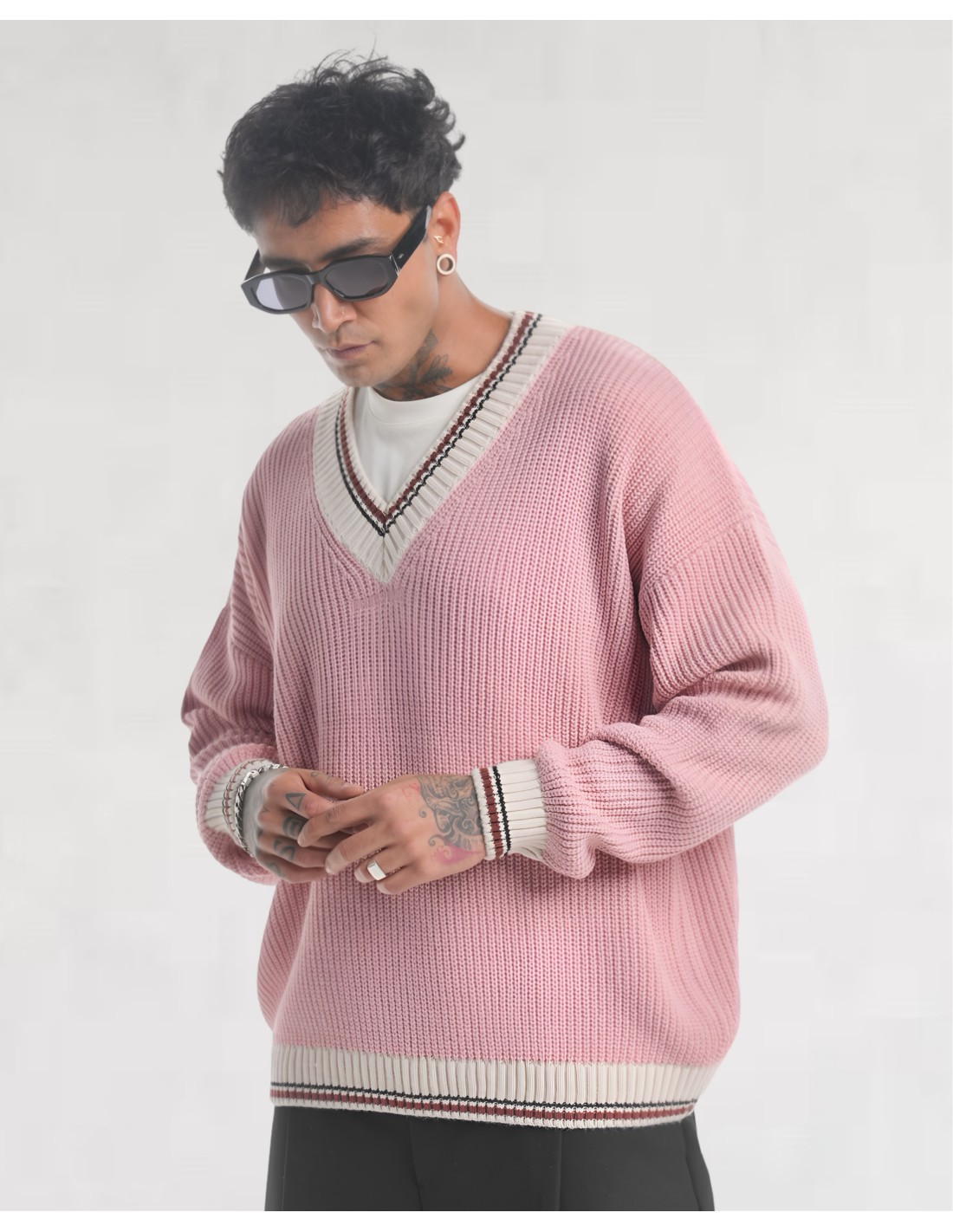 Pull col V en grosse maille rose
