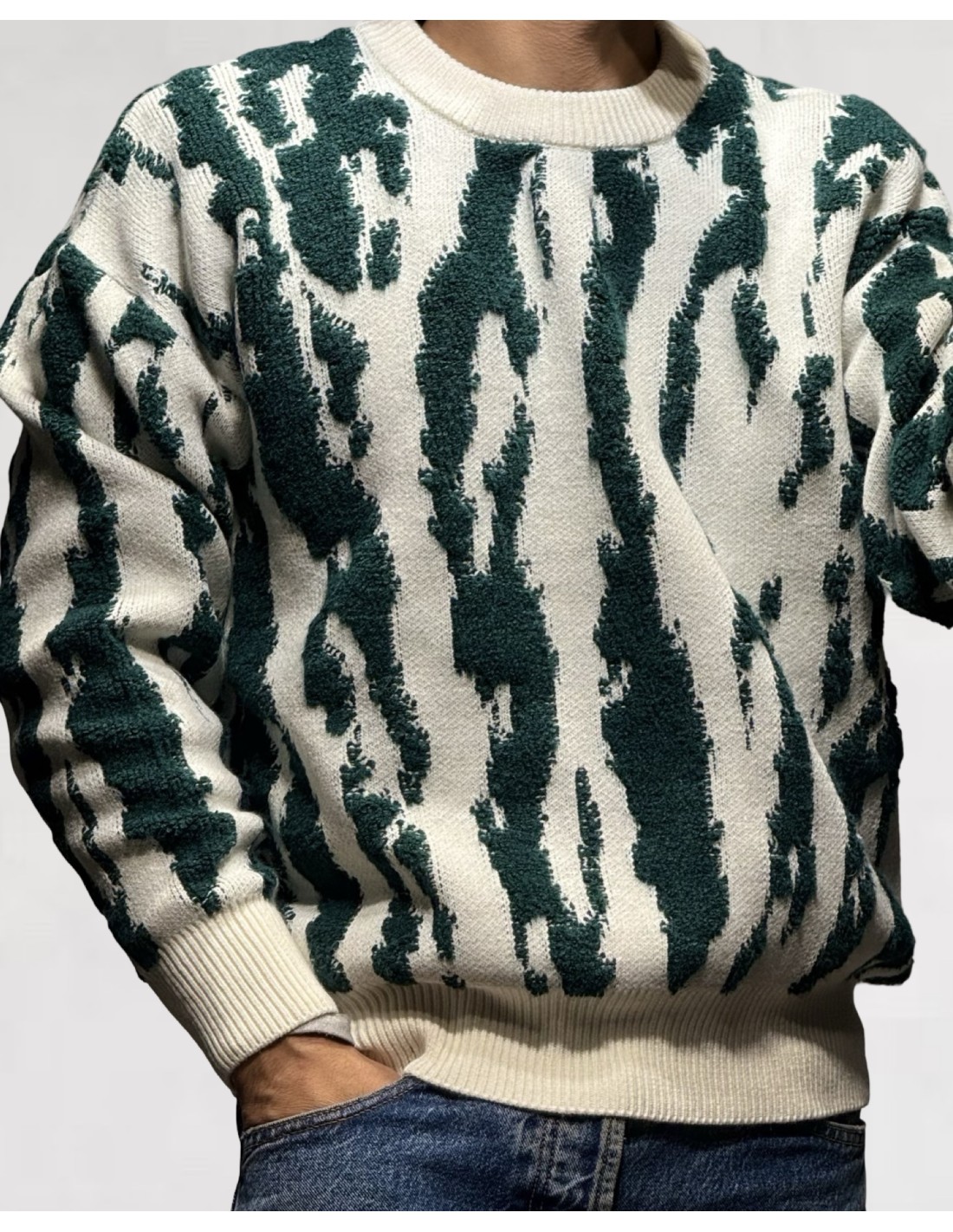 Ce pull texturé effet savane vert et blanc affiche un look fort et contemporain. Confectionné dans une maille épaisse et moelleuse, il séduit par son motif abstrait effet brossé qui lui confère une allure à la fois graphique et urbaine.
