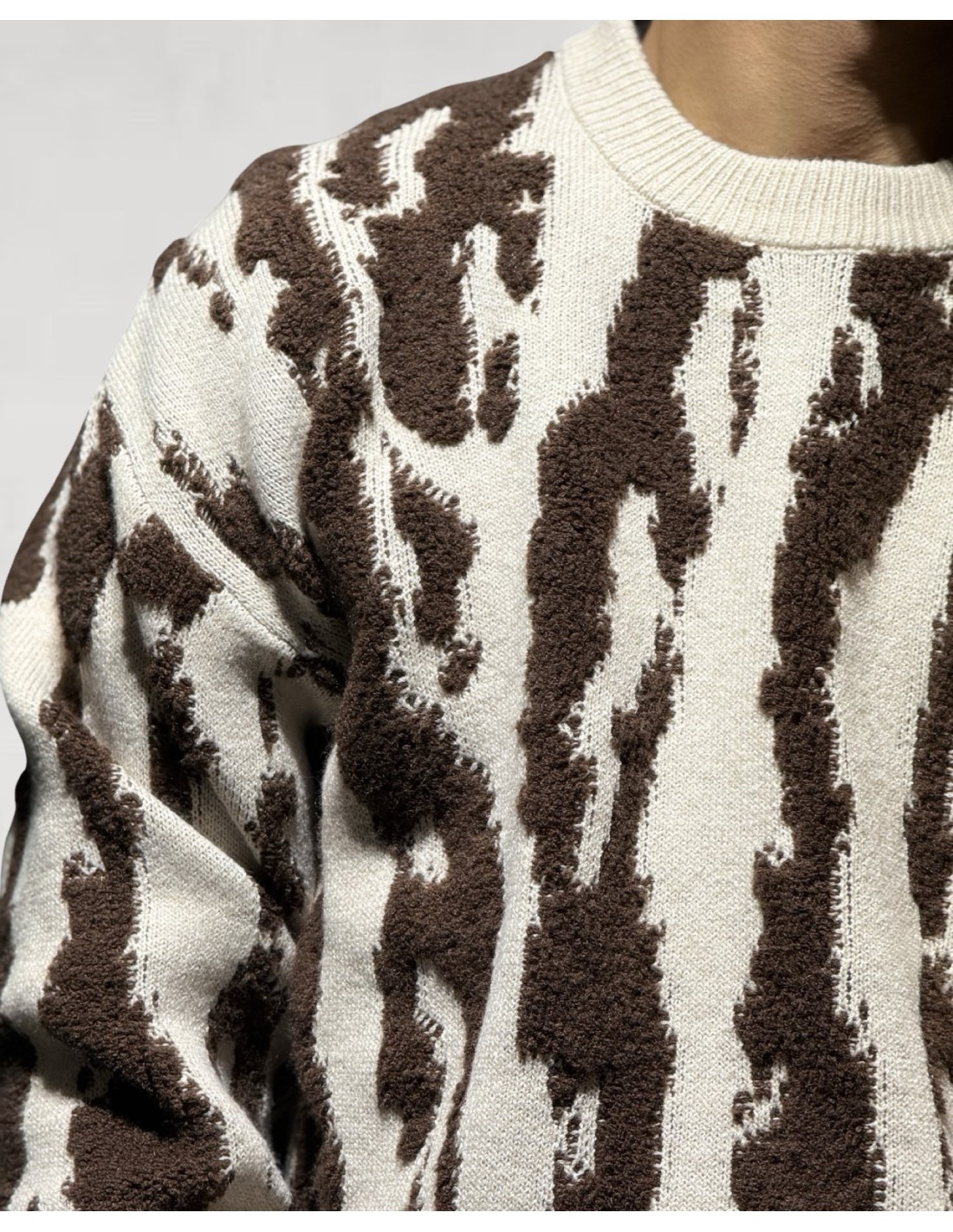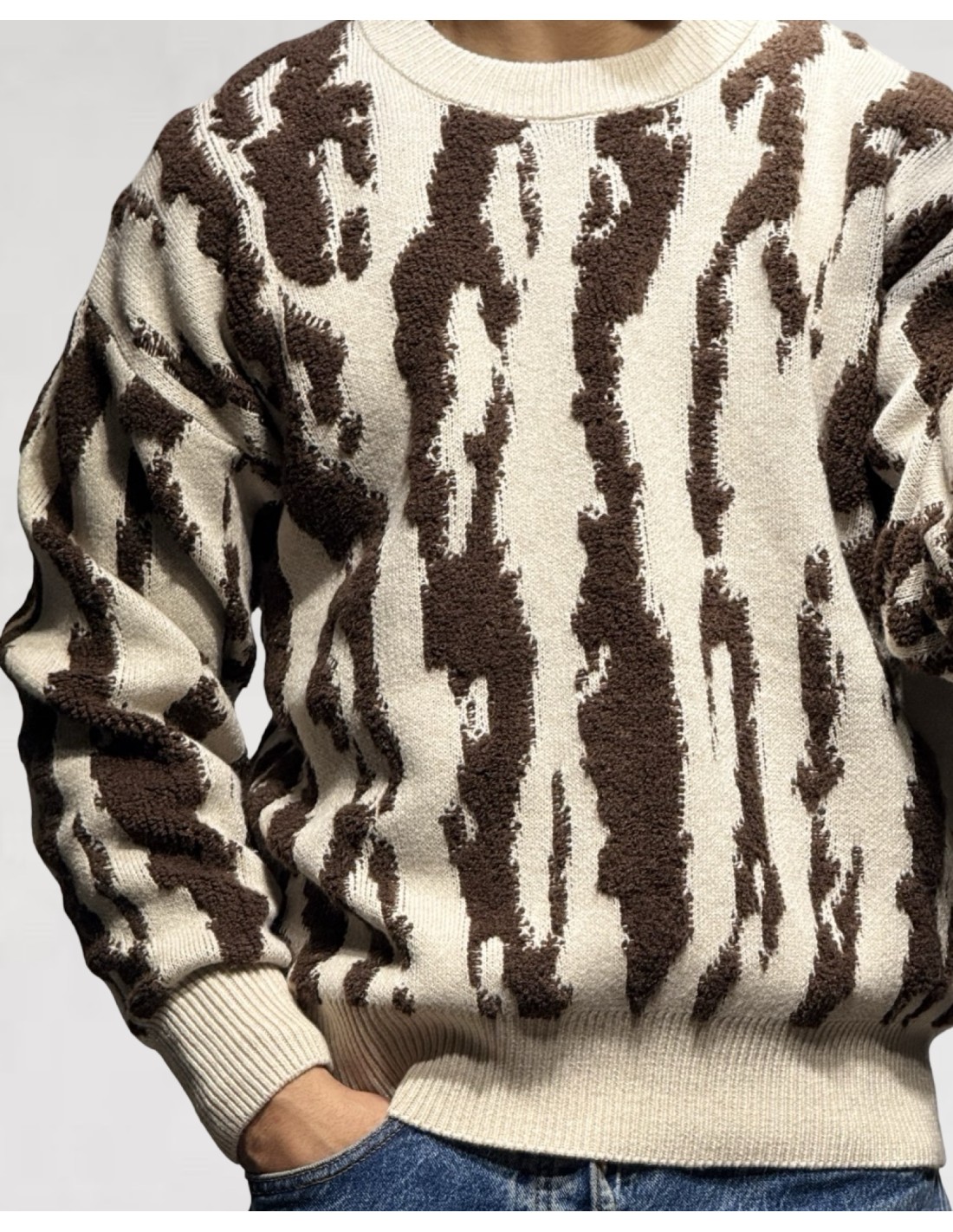 Ce pull texturé marron et écru affiche un look fort et contemporain. Confectionné dans une maille épaisse et moelleuse, il séduit par son motif abstrait style savane et effet brossé qui lui confère une allure à la fois graphique et urbaine.