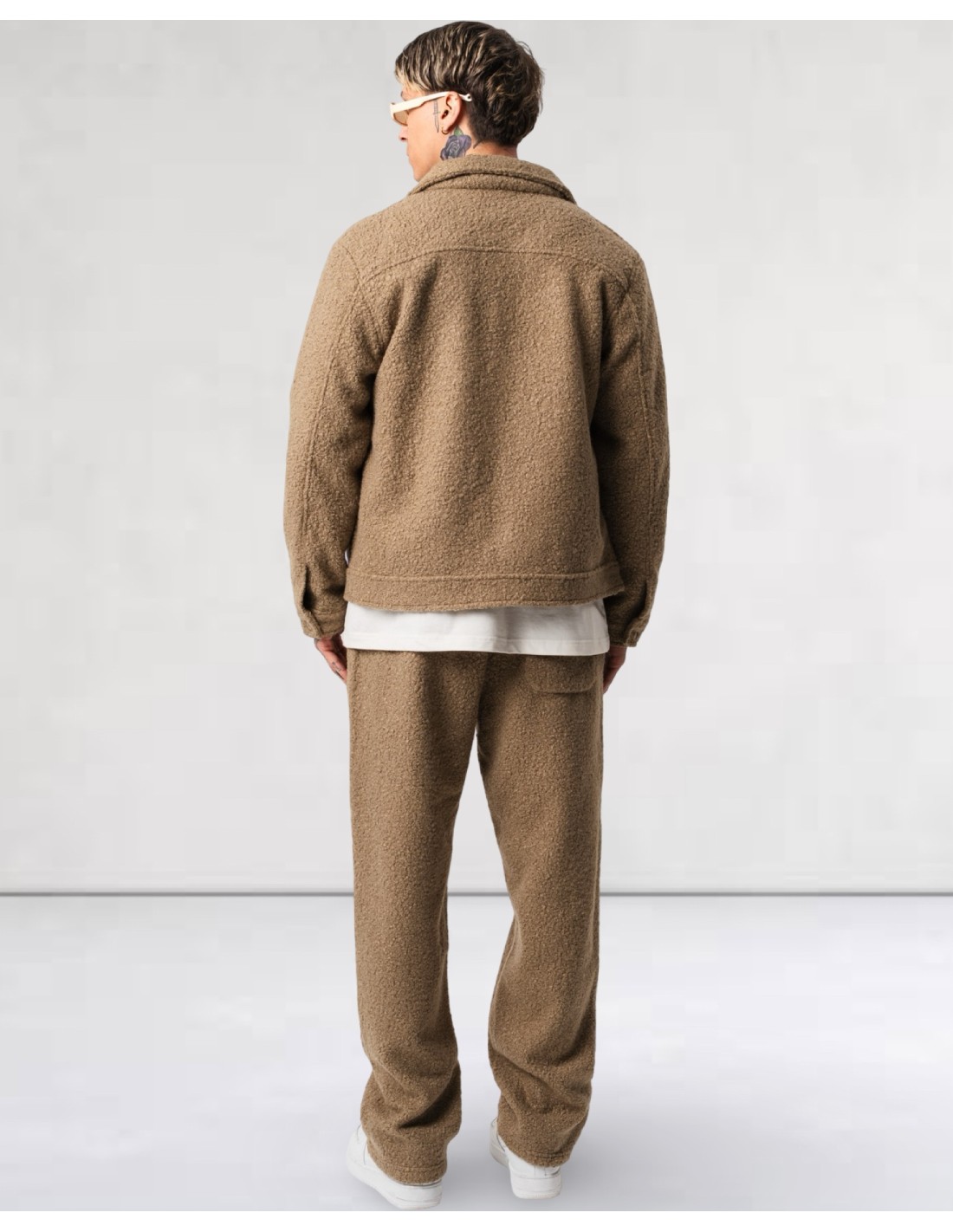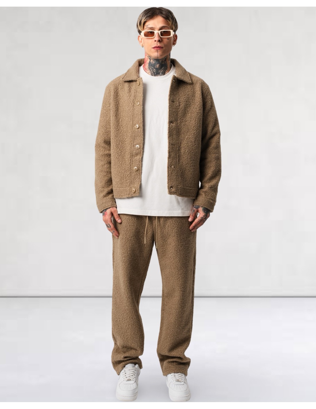 Ensemble en matière effet « teddy » ultra-douce, composé d’une veste boutonnée et d’un pantalon assorti.