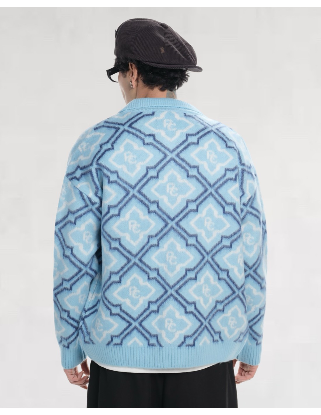 Gilet-veste zippé en maille douce effet mohair, avec ses motifs géométrique mêlant deux nuances de bleu. Coupe légèrement oversize pour un style moderne et confortable. Col chemise, zip métal double curseur, texture chaude idéale mi-saison et hiver. Facile à porter avec un jean, un cargo ou un pantalon droit.