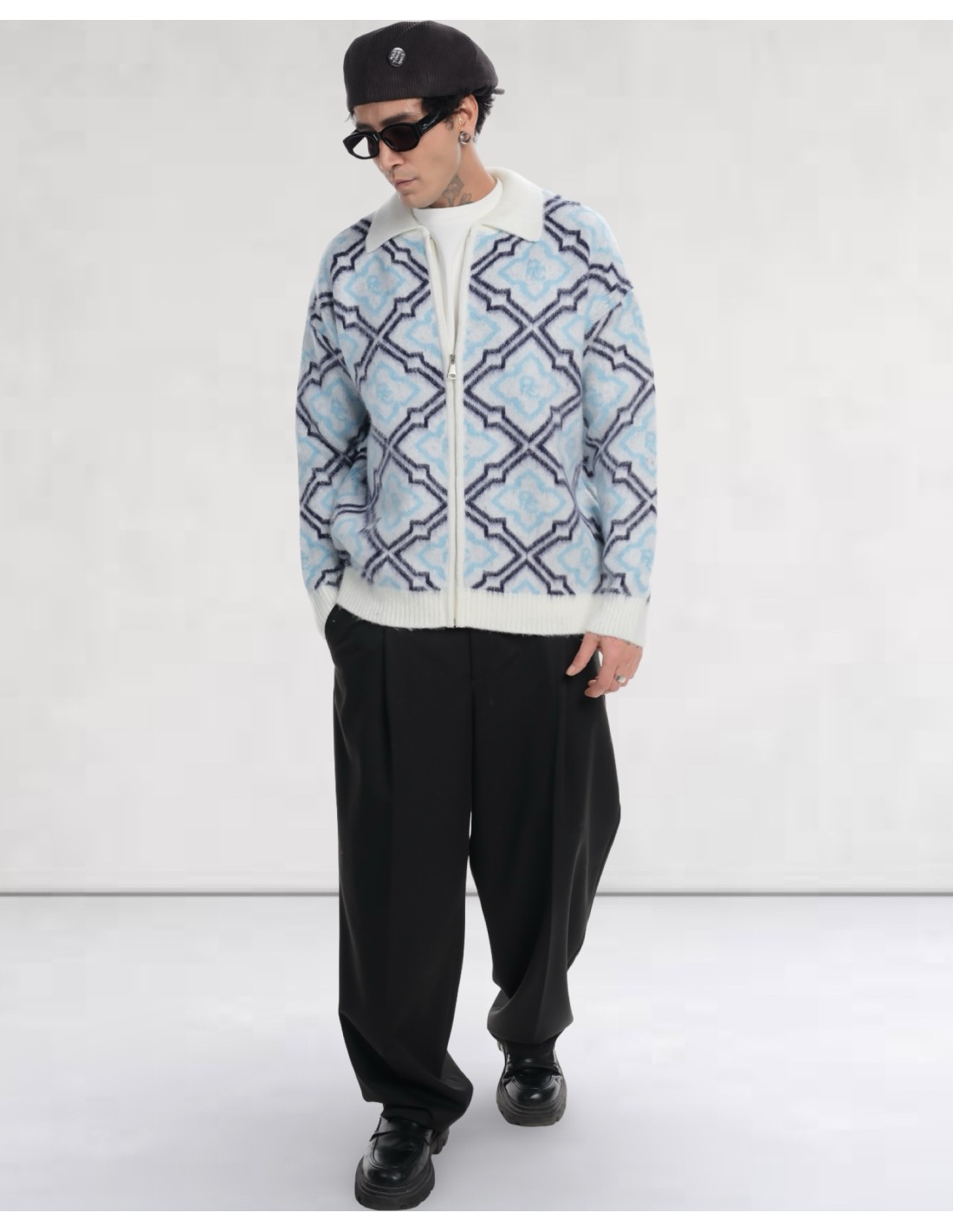 Gilet-veste zippé en maille douce effet mohair, avec ses motifs géométrique mêlant deux nuances de bleu. Coupe légèrement oversize pour un style moderne et confortable. Col chemise, zip métal double curseur, texture chaude idéale mi-saison et hiver. Facile à porter avec un jean, un cargo ou un pantalon droit.