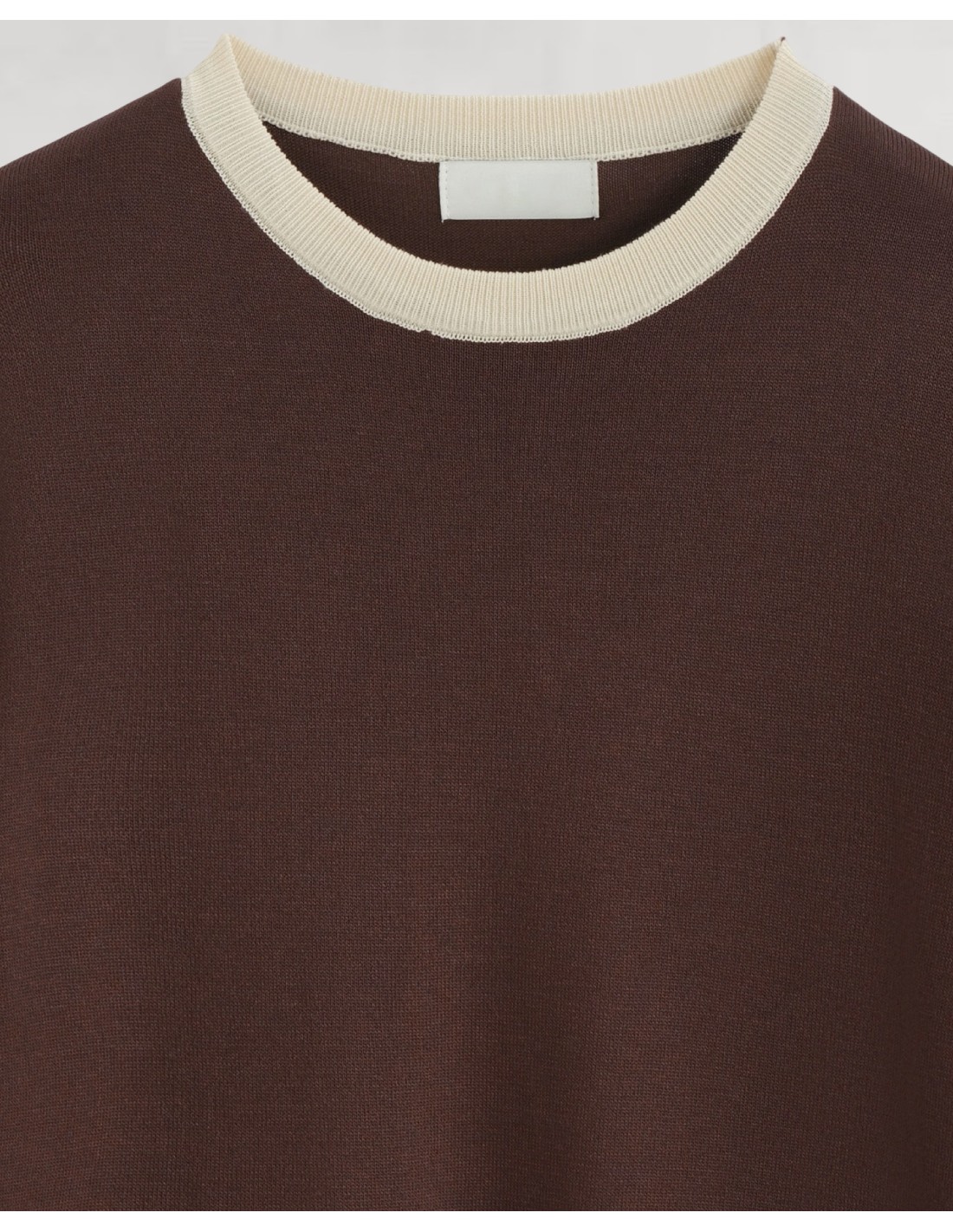 T-shirt en maille fine à manches courtes, au coloris marron avec finitions beige contrastées.