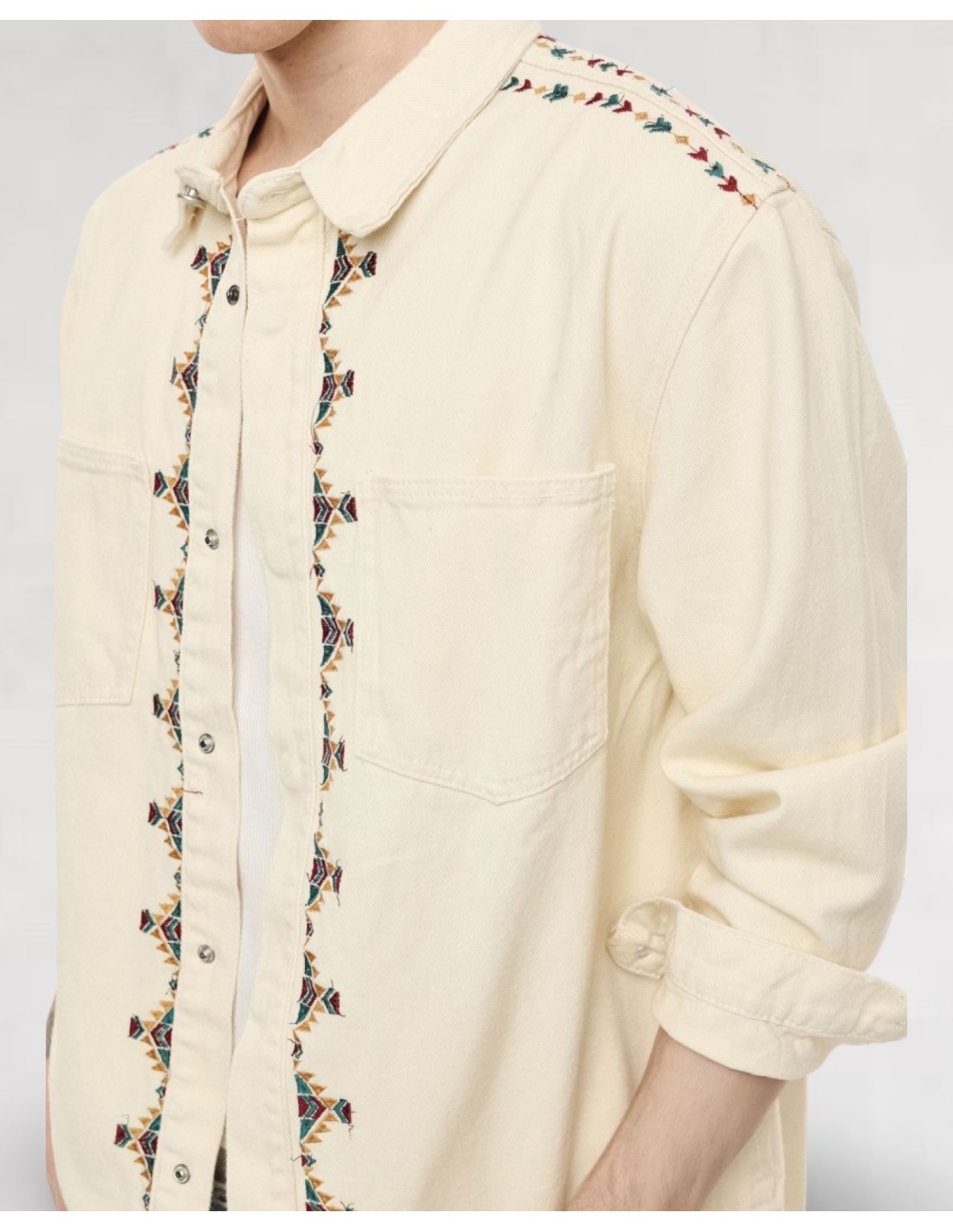 Chemise à manches longues, coupe droite, ornée de broderies géométriques multicolores sur le devant, les épaules et les poignets. Elle dispose de deux poches poitrine et d'une fermeture boutonnée. Convient à ceux qui souhaitent affirmer leur individualité au sein d'une garde-robe citadine.