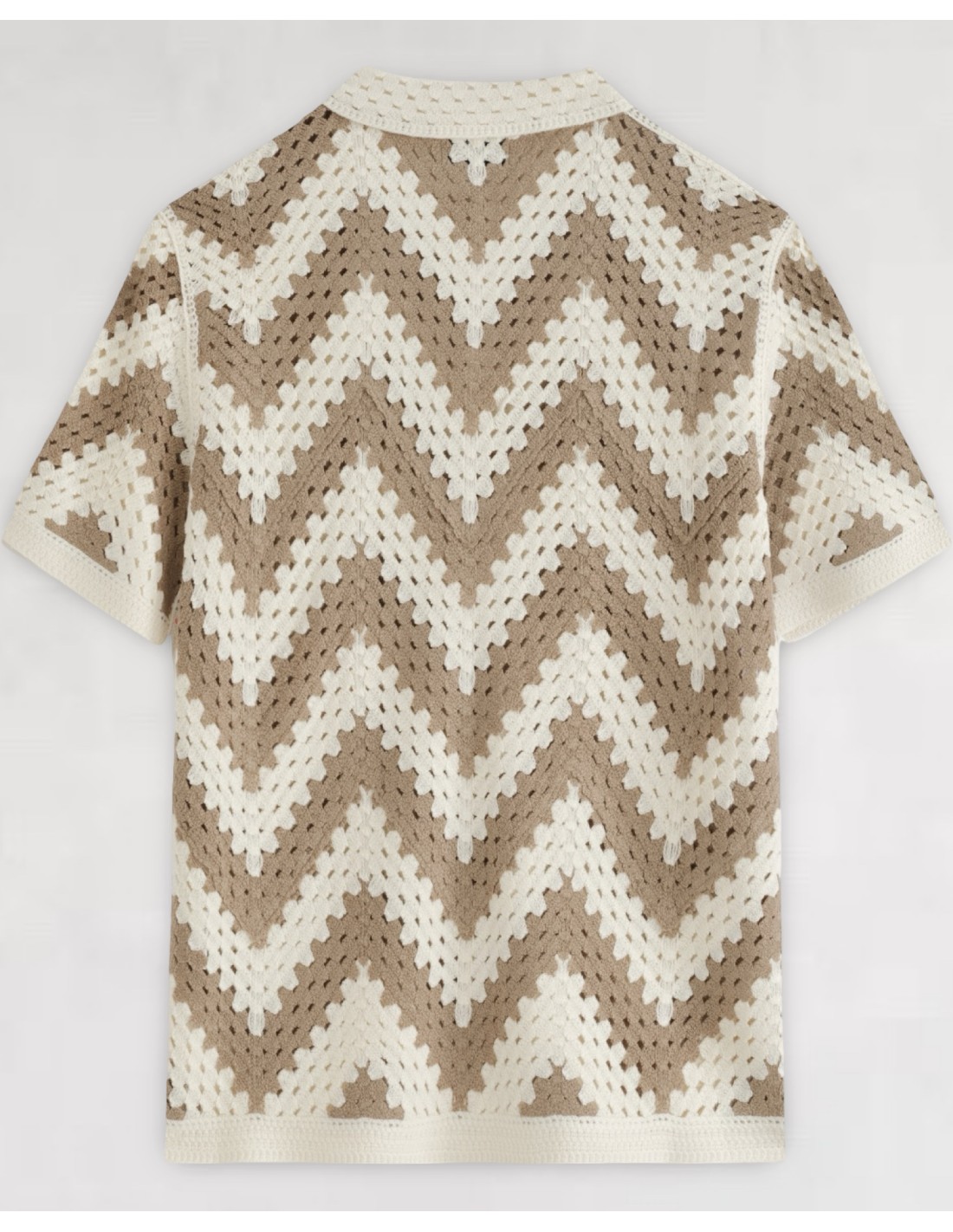 Chemisette en maille crochetée au style estival et rétro, caractérisée par un motif graphique en zigzag alternant beige et écru. Sa texture ajourée apporte légèreté et respirabilité, idéale pour les journées chaudes. Elle est dotée d’un col classique, d’une fermeture boutonnée sur le devant et de manches courtes pour un look décontracté mais soigné. Les finitions côtelées au col, aux manches et à la base assurent une belle tenue. Parfaite portée seule ou ouverte sur un t-shirt pour une allure estivale tendance.