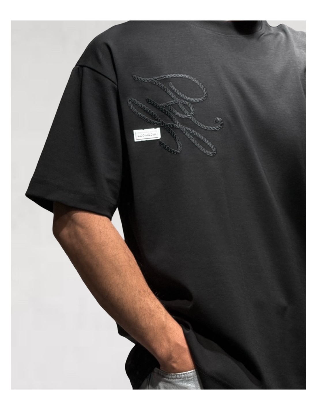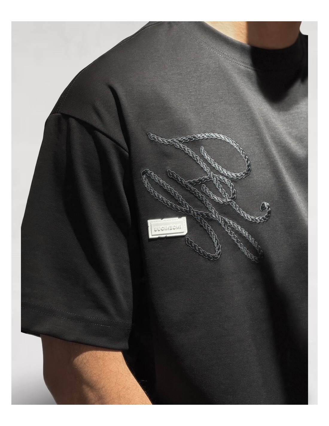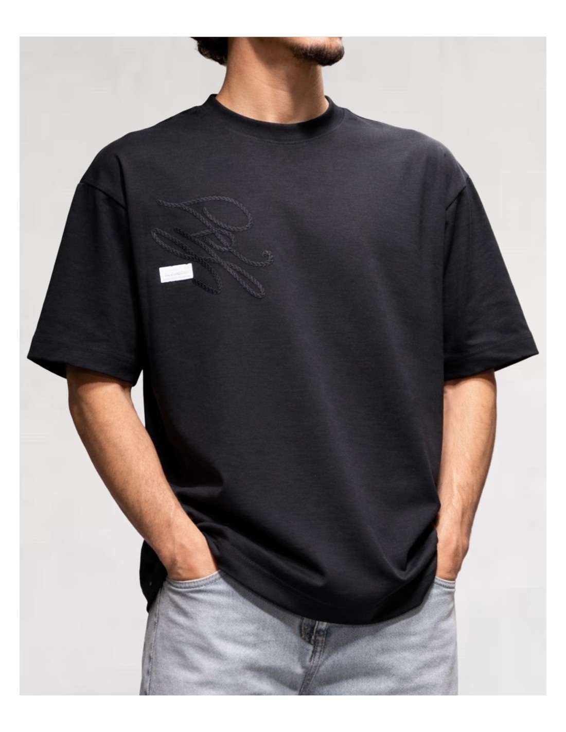 Le modèle se distingue par son motif brodé ton sur ton sur la poitrine, réalisé en relief façon corde, qui apporte du caractère et une touche graphique subtile.