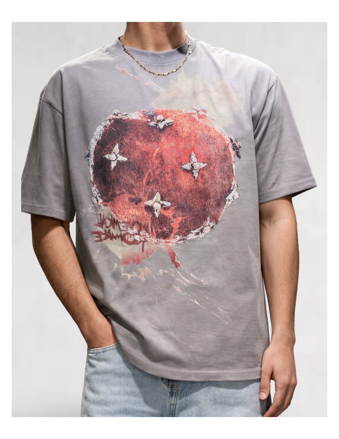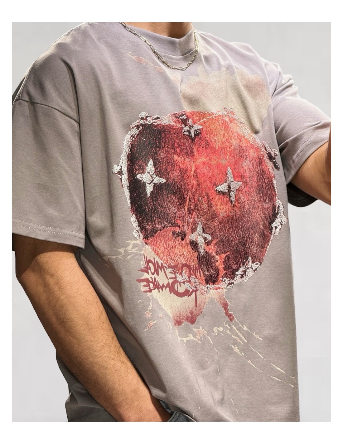 Coupe ample, silhouette clean, base minimaliste. Puis le graphisme frappe au centre : un cœur brut, presque organique, traité comme une œuvre street, entre peinture éclatée et relief texturé.