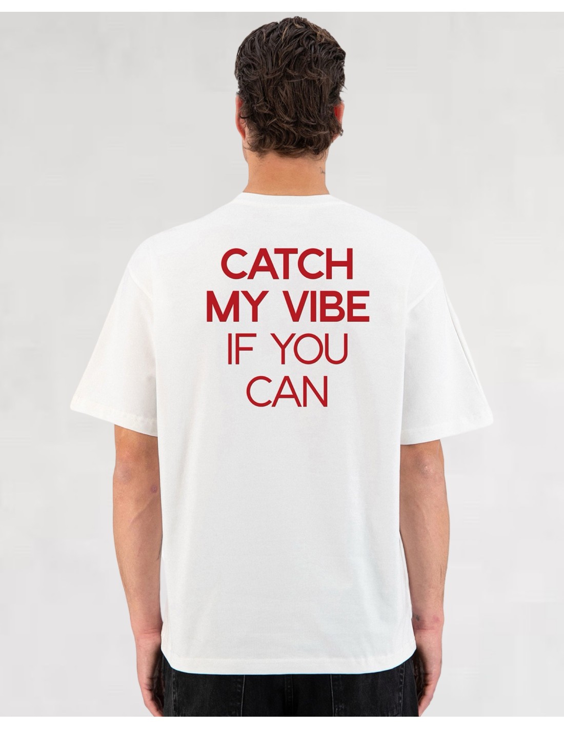 À l’avant, un lettrage minimal “ENERGY” posé au centre vient signer la pièce avec discrétion. À l’arrière, le message prend toute son ampleur avec un visuel typographique bold : “Catch My Vibe If You Can”, pour une attitude affirmée et une vraie identité.