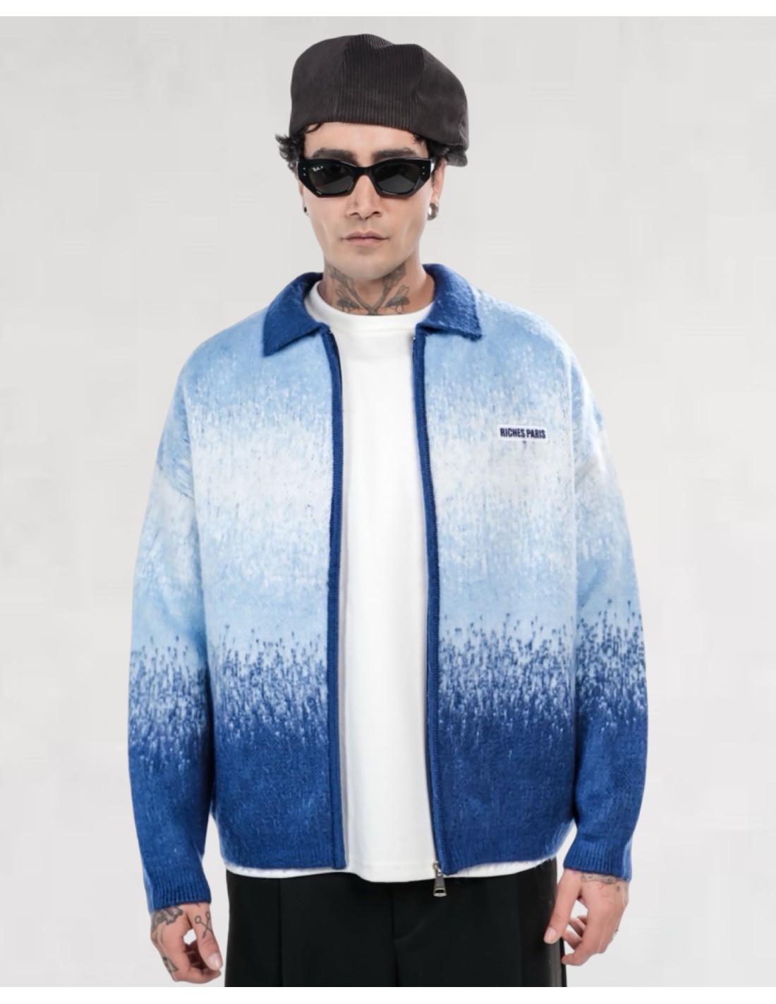 Gilet-veste zippé en maille douce effet mohair, avec dégradé bleu clair → blanc → bleu marine. Coupe légèrement oversize pour un look moderne et confortable. Col chemise, zip métal double curseur, finition chaude idéale mi-saison et hiver. Se porte facilement avec un jean, un pantalon droit ou un cargo noir.